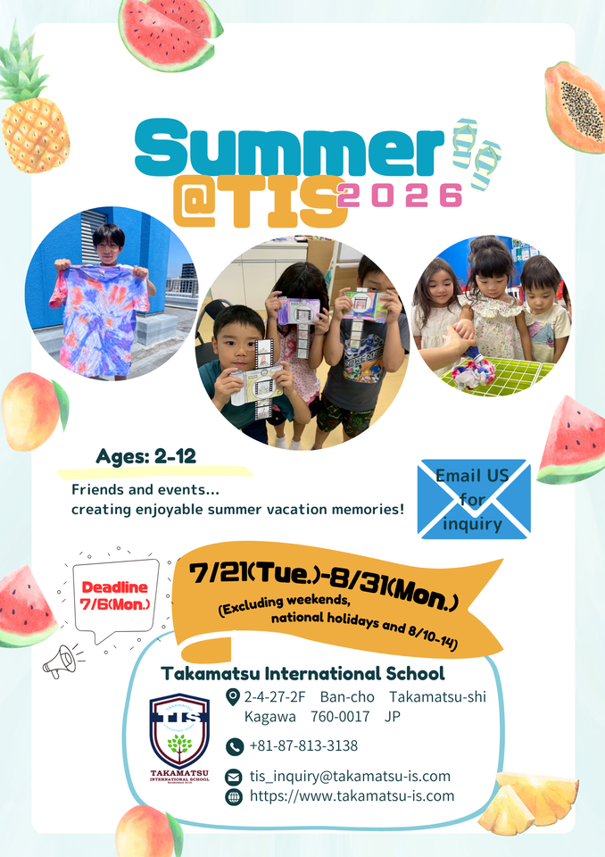 Takamatsu International School welcomes children ages 2-12 to our English summer program designed especially for international and bilingual families.
